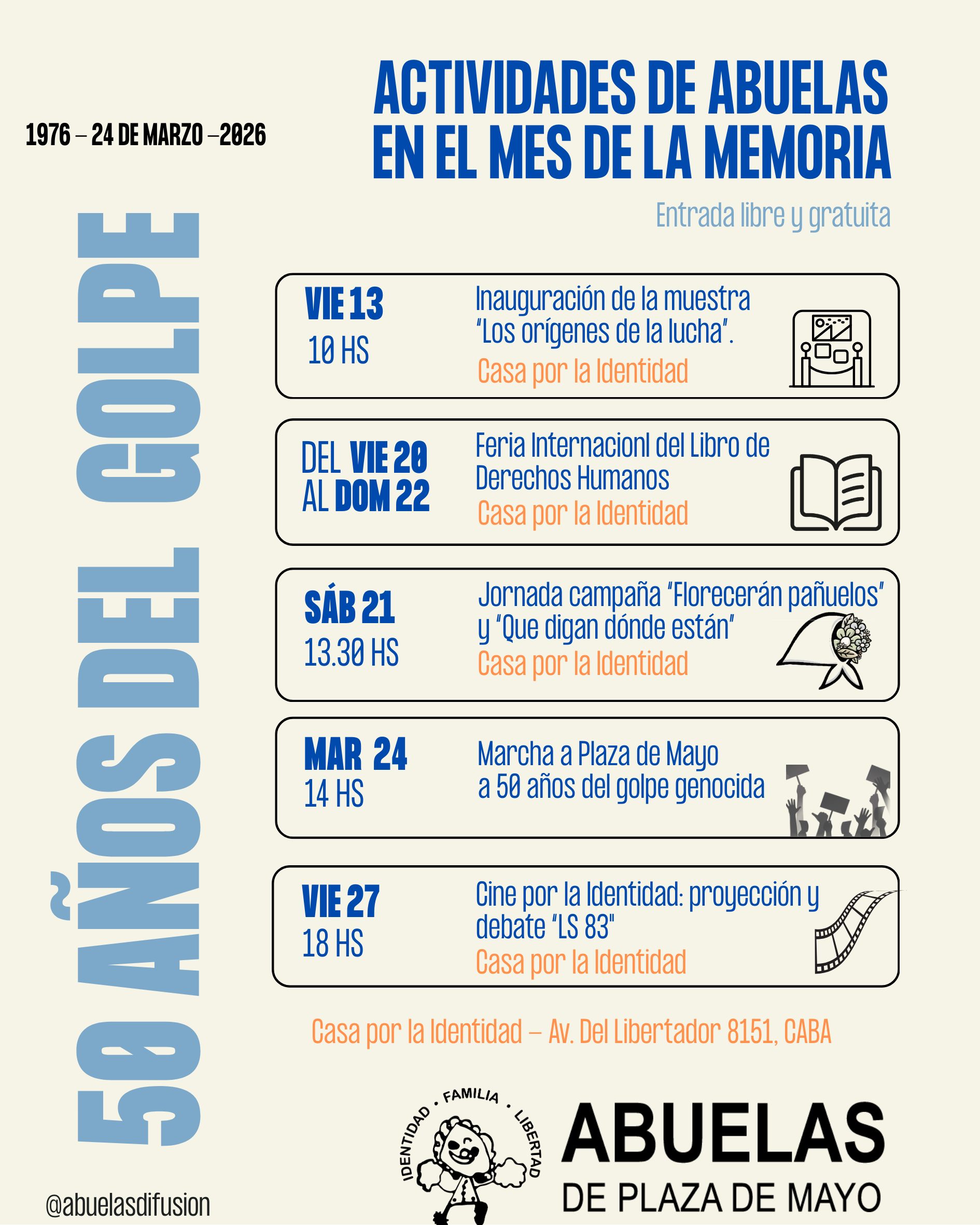 También nos sumamos a la segunda “Feria Internacional del libro de derechos humanos” los días 20, 21, y 22 de marzo. Tendremos múltiples charlas y presentaciones de libros en el auditorio y en la sala fotográfica “Cuando hablan las imágenes” de la Casa por la Identidad. El viernes 20 será el turno de los autores Paula Bombara, Mario Méndez y Federico Llorenz, para hablar de la propuesta de Editorial Norma Un golpe a la democracia, a las 14 hs. A las 15.30 hs. será la presentación del libro Te voy a contar quién soy, de Marcela Bublik y a las 18 hs. del libro Leonor, de Florencia Akiki. Las autoras serán acompañadas por miembros de la institución. El sábado 21 se presentará el libro de la periodista estadounidense Haley Cohen A Flower traveled in the bood (14.30 hs), junto a los nietos Guillermo Pérez Roisinblit y Claudia Poblete Hlaczik. A las 16 hs. Juan Carrá, acompañado por la familia Molfino de quien narra la historia, presentará su obra Salvate vos. Por último, el periodista Washington Uranga conversará, presentará Hacer la revolución: guerrillas latinoamericanas (18 hs.) junto al autor, Aldo Marchesi. El domingo 22 las actividades serán: presentación del ensayo fotográfico La luz prohibida (16 hs.), de Malena Cagna, con la participación del fotógrafo Juan Travnik y la investigadora Cora Gamarnik. A las 17 hs. María Eugenia Ludueña presenta la actualización de su libro Laura. Historia de vida y militancia, junto a la familia Carlotto. Por último, se realizará una mesa redonda internacional sobre Negacionismo y políticas de memoria, junto a la fundación Rosa Luxemburgo, a las 18 hs. con los especialistas Luyara Franco, Federico Mastrogiovanni, Fabiola Rodríguez Salazar, Nacho Levy y Javier Pineda.
